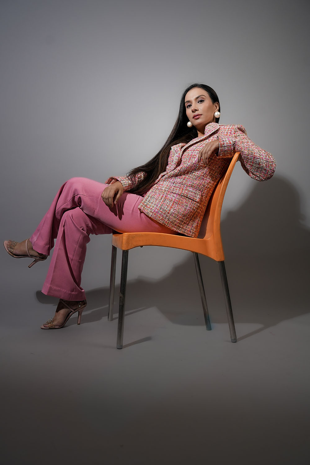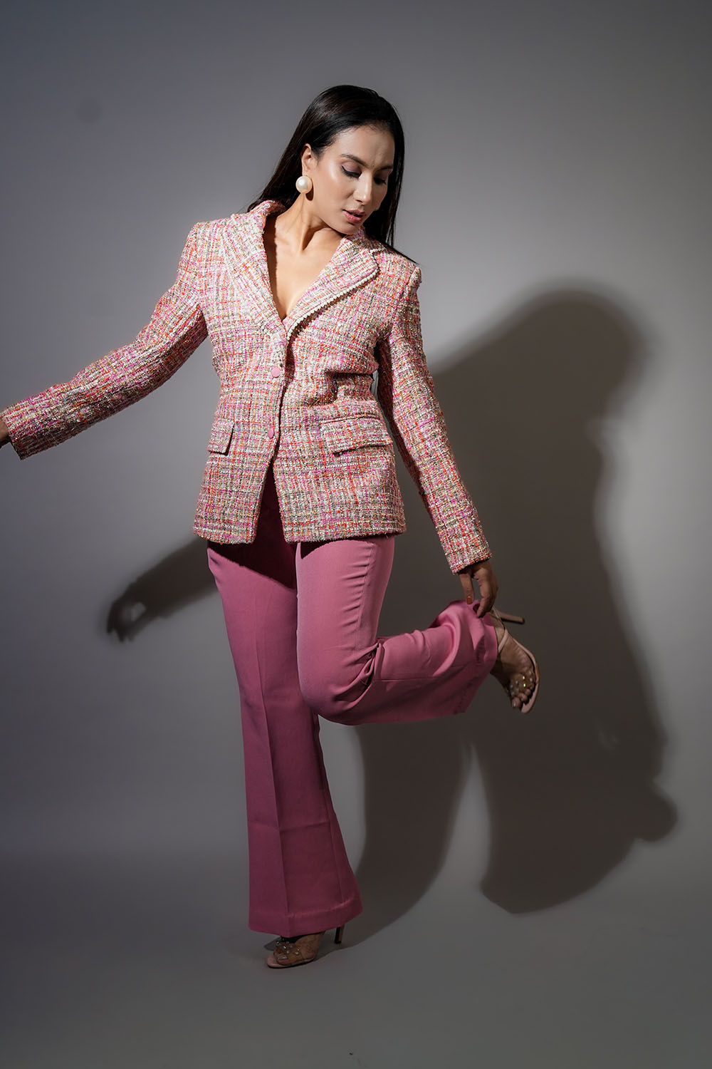 Playful yet polished — this pink tweed suit is a celebration of confidence in colour. Structured tailoring meets feminine tones for a look that transitions seamlessly from boardroom to brunch.